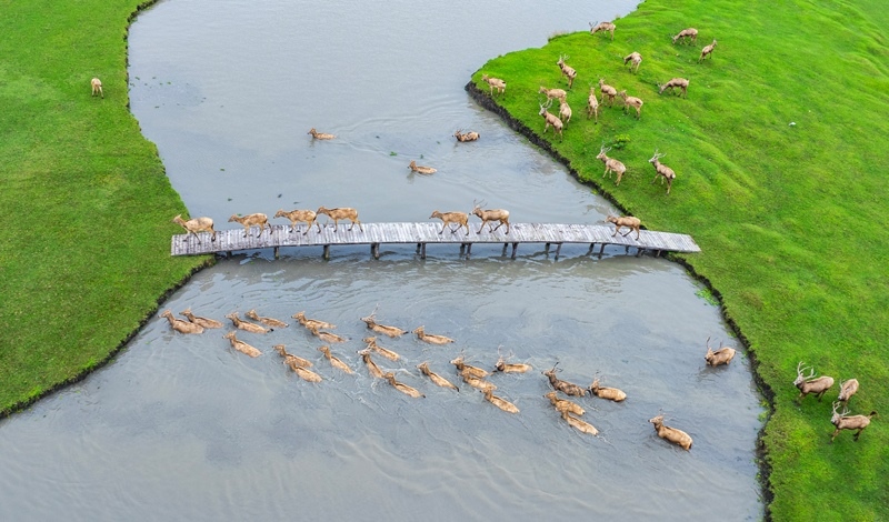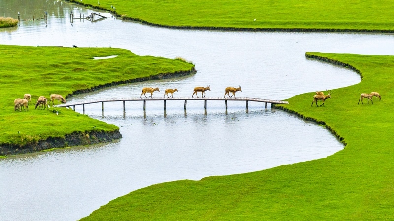 10月17日,在江蘇省泰州市姜堰區(qū)溱湖國家濕地公園,一群麋鹿通過獨(dú)木橋(無人機(jī)照片)。
