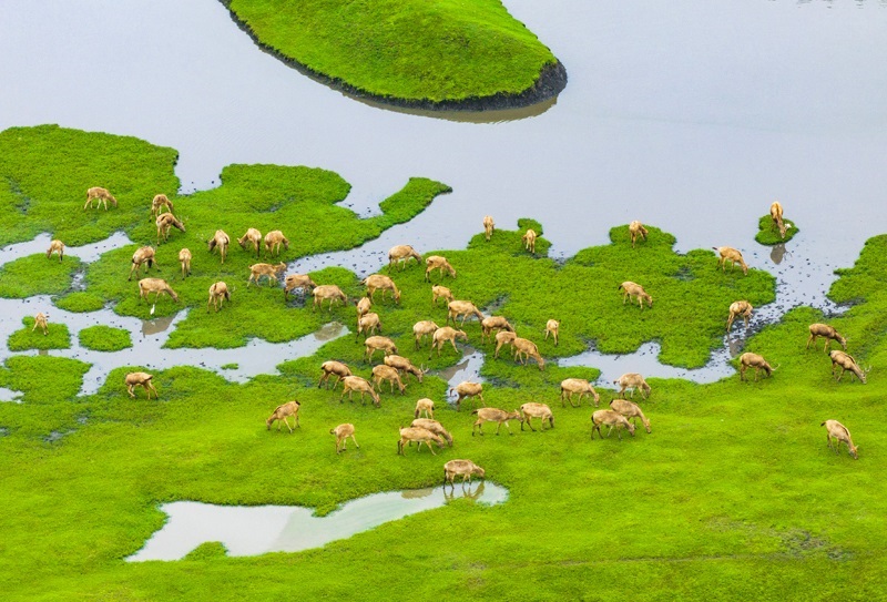 10月17日,在江蘇省泰州市姜堰區(qū)溱湖國家濕地公園,一群麋鹿在棲息、覓食(無人機(jī)照片)。