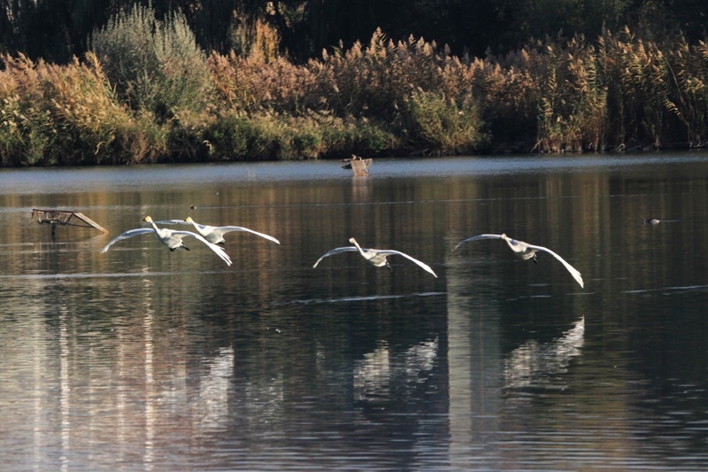 10月17日在甘肅省張掖市國家濕地公園鶴影湖拍攝的白天鵝。