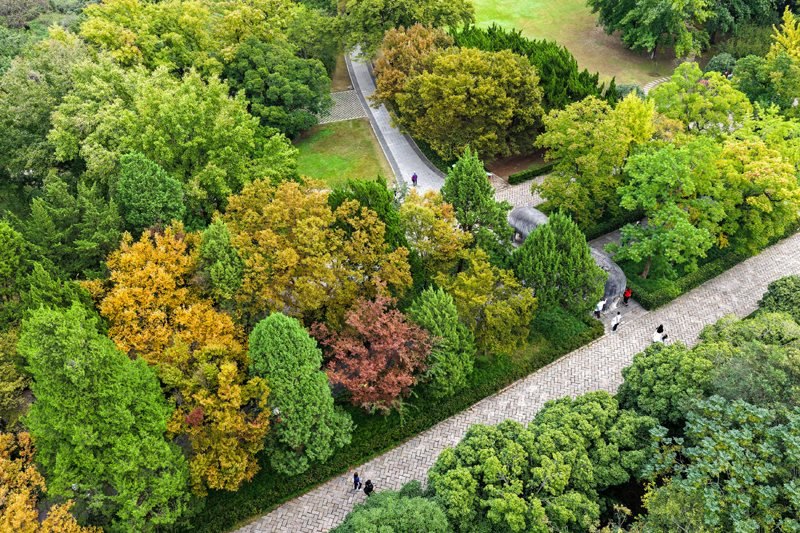 10月17日,游人在南京明孝陵景區(qū)石象路賞景游玩(無人機(jī)照片)。
