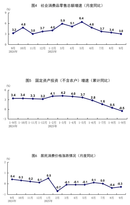 前三季度,全國工業(yè)生產(chǎn)者出廠價格同比下降2.8%。其中,9月份同比下降2.3%,降幅比上月收窄0.6個百分點,環(huán)比持平。前三季度,工業(yè)生產(chǎn)者購進價格同比下降3.2%。其中,9月份同比下降3.1%,降幅比上月收窄0.9個百分點,環(huán)比上漲0.1%。