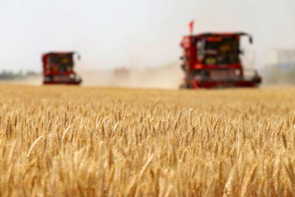 5月28日,在安徽省淮北市濉溪縣五溝鎮(zhèn)廟前村,農(nóng)機手駕駛收割機收割小麥。新華社發(fā)(萬善朝 攝)