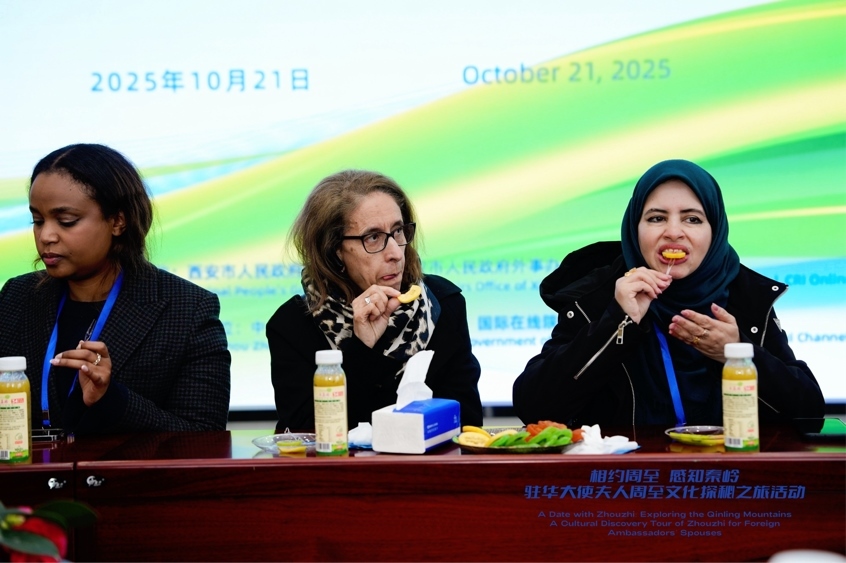駐華大使夫人品嘗著不同品種的獼猴桃以及各式各樣的獼猴桃深加工食品,紛紛稱贊其細膩的口感、獨特的風味和濃郁的果香。“這不僅是一次味覺的享受,更是一次對中國鄉(xiāng)村產(chǎn)業(yè)振興的直觀感受。”摩洛哥駐華大使夫人表示,“我非常期待后續(xù)可以和周至合作,因為摩洛哥很喜歡這種水果,我也希望可以在這里學到一些產(chǎn)業(yè)發(fā)展的知識,并把這些知識帶回我們國家。”
