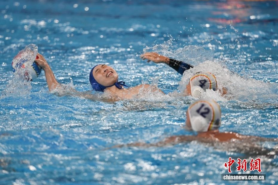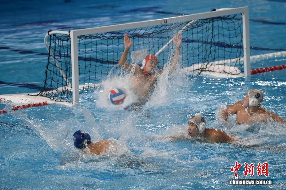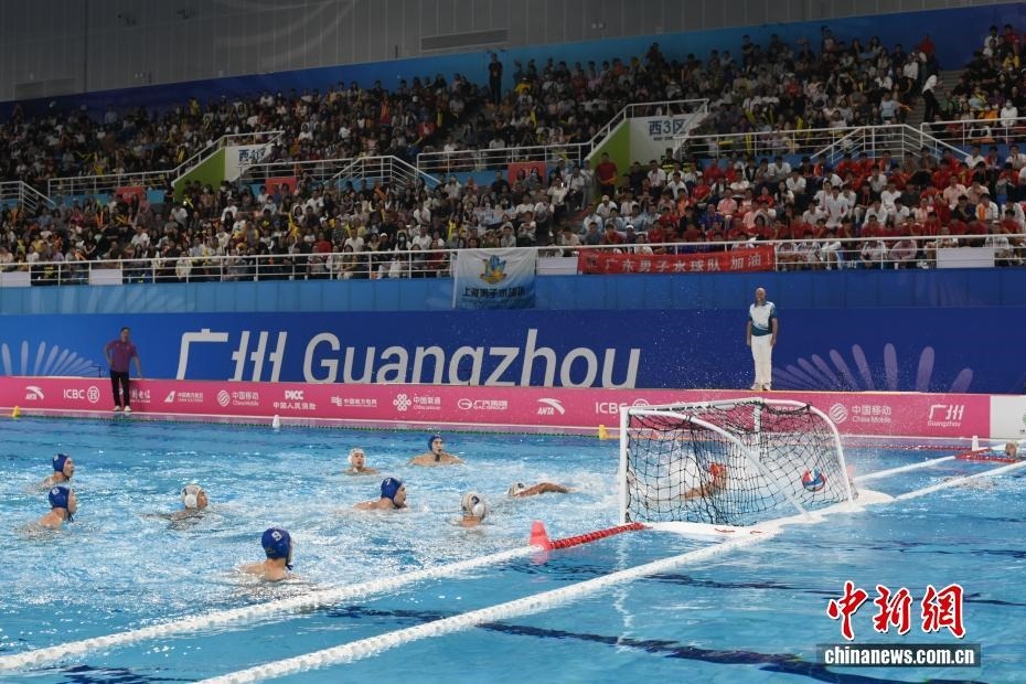 10月27日晚,在廣東廣州舉行的第十五屆全國運動會水球男子組比賽金牌賽中,廣東隊以16比9戰(zhàn)勝上海隊,獲得金牌。圖為上海隊11號運動員蔡宇浩(白帽)在比賽中進攻。