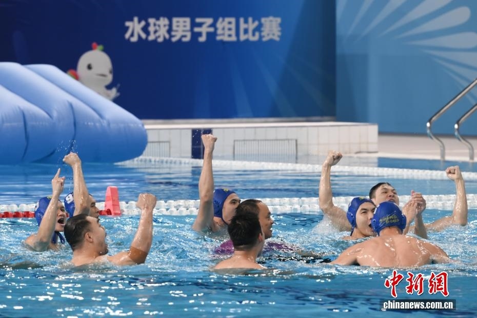 10月27日晚,在廣東廣州舉行的第十五屆全國運動會水球男子組比賽金牌賽中,廣東隊以16比9戰(zhàn)勝上海隊,獲得金牌。圖為廣東隊慶祝比賽獲勝。