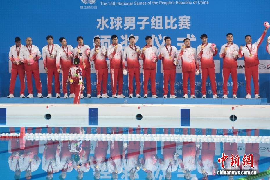 10月27日晚,在廣東廣州舉行的第十五屆全國運動會水球男子組比賽金牌賽中,廣東隊以16比9戰(zhàn)勝上海隊,獲得金牌。圖為廣東隊在頒獎儀式向觀眾致謝。