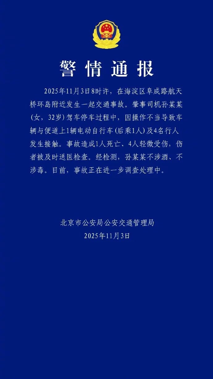 中國網(wǎng)11月3日訊 11月3日,北京交警發(fā)布通報,當日8時許,在海淀區(qū)阜成路航天橋環(huán)島附近發(fā)生一起交通事故。肇事司機孫某某(女,32歲)駕車停車過程中,因操作不當導致車輛與便道上1輛電動自行車(后乘1人)及4名行人發(fā)生接觸。事故造成1人死亡、4人輕微受傷,傷者被及時送醫(yī)檢查。經(jīng)檢測,孫某某不涉酒、不涉毒。目前,事故正在進一步調(diào)查處理中。