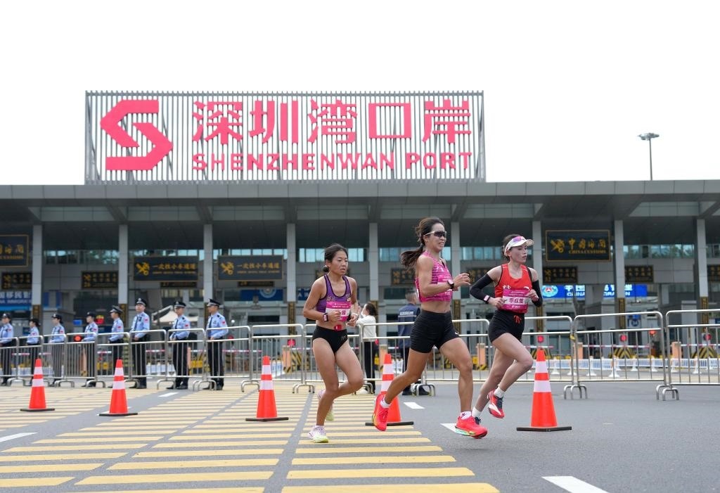 11月15日,第十五屆全國(guó)運(yùn)動(dòng)會(huì)田徑項(xiàng)目女子馬拉松比賽參賽選手經(jīng)過深圳灣口岸。新華社記者 丁增尼達(dá) 攝