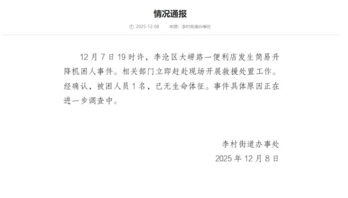 中新網(wǎng)12月8日電 青島李村街道辦事處8日在青島李滄政務網(wǎng)發(fā)布情況通報稱,12月7日19時許,李滄區(qū)大嶗路一便利店發(fā)生簡易升降機困人事件。相關部門立即趕赴現(xiàn)場開展救援處置工作。經(jīng)確認,被困人員1名,已無生命體征。事件具體原因正在進一步調(diào)查中。