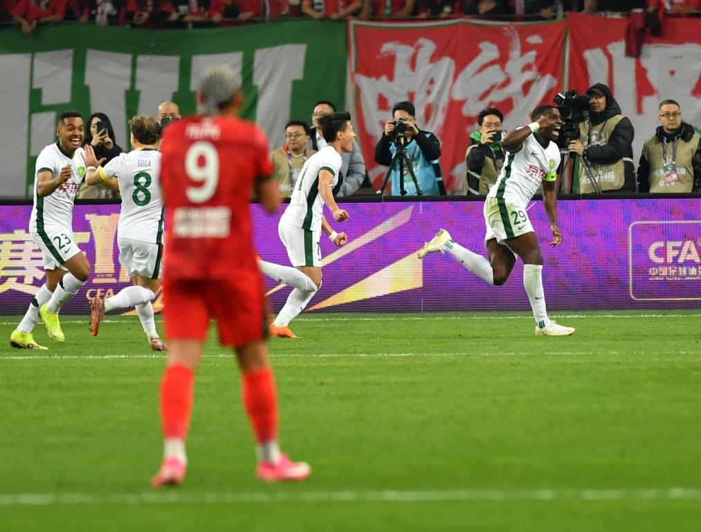 12月6日,北京國(guó)安隊(duì)球員法比奧(右一)在比賽中慶祝進(jìn)球。新華社記者 李嘉南 攝