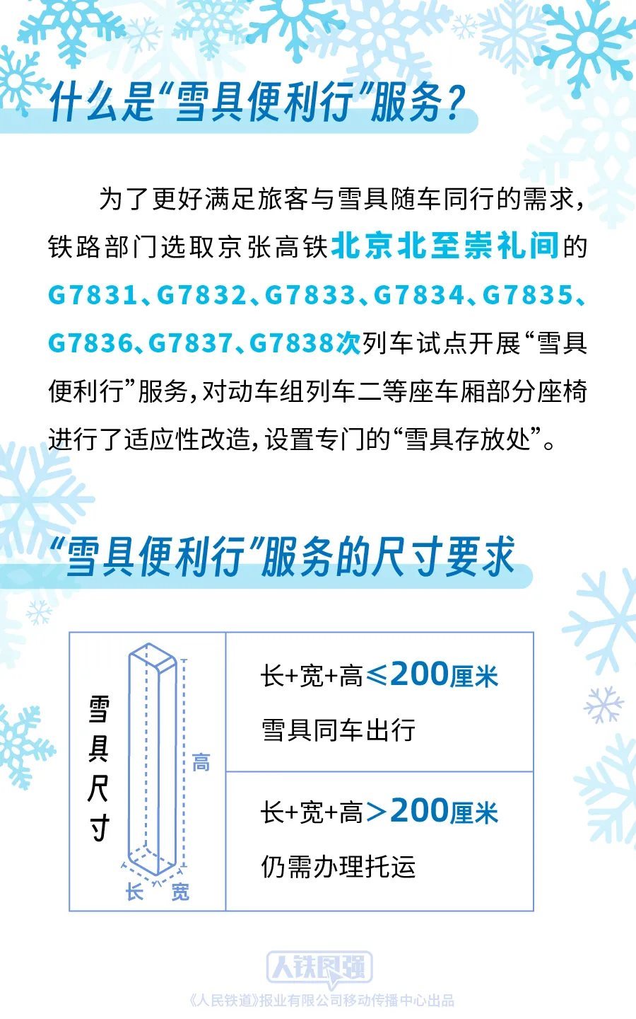鐵路部門堅持以人民為中心的發(fā)展思想,持續(xù)深化運輸供給側結構性改革,積極適應旅客多樣化的出行需求,為攜帶雪具出行的旅客提供便捷服務。前期,鐵路部門按照《國鐵集團鐵路旅客運輸規(guī)程》“旅客乘坐動車組列車隨身攜帶的行李物品長、寬、高之和不超過130厘米”的規(guī)定,對超過上述尺寸標準的雪具推出了“雪具快運”服務。為了更好滿足旅客與雪具隨車同行的需求,鐵路部門統籌考慮旅客安全、乘車秩序和雪具運輸需求,選取京張高鐵北京北至崇禮間的G7831、G7832、G7833、G7834、G7835、G7836、G7837、G7838次列車試點開展“雪具便利行”服務,對動車組列車二等座車廂部分座椅進行了適應性改造,設置專門的“雪具存放處”,旅客選擇該服務后可攜帶長、寬、高之和不超過200厘米的雪具同車出行,滑雪更加方便快捷。對于長、寬、高之和超過200厘米的雪具,由于高鐵列車車內空間限制,仍需辦理托運。