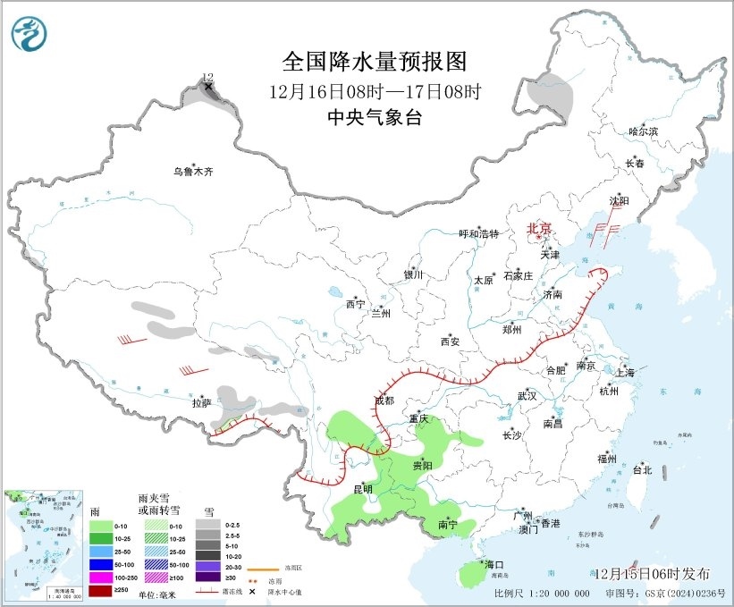 全國(guó)降水量預(yù)報(bào)圖(12月16日08時(shí)-17日08時(shí))