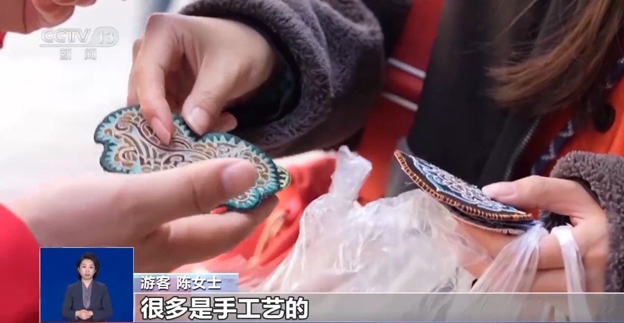 游客 陳女士:就買了一個(gè)包、一幅畫(huà),然后還有兩個(gè)貼片。很多是手工藝的。