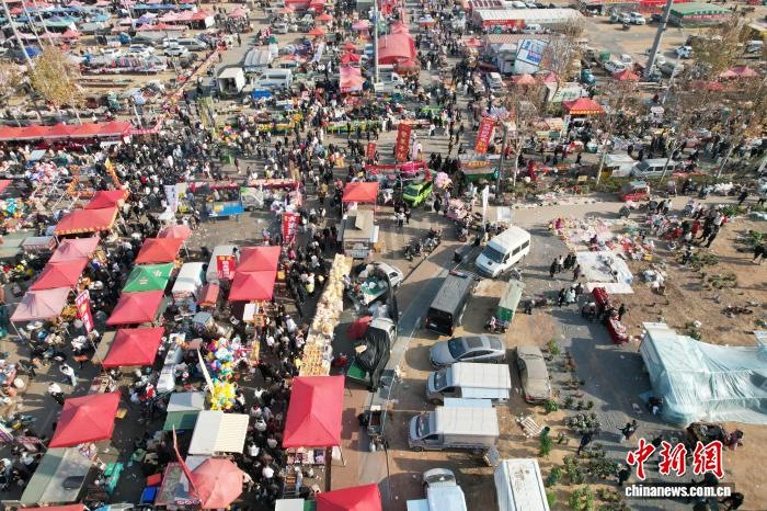 12月8日,山東省臨沂市臨沭縣,民眾暢游曹洼大集。近期,曹洼大集憑借超高性價(jià)比的特色美食、濃郁的民俗氛圍、線上線下聯(lián)動(dòng)的鮮活場(chǎng)景火爆全網(wǎng)。(無人機(jī)照片) 中新社記者 王峰 攝