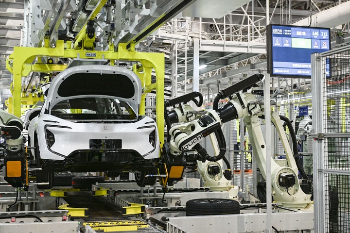 2025年3月6日在位于重慶的長(zhǎng)安汽車(chē)數(shù)智工廠總裝車(chē)間拍攝的自動(dòng)化生產(chǎn)作業(yè)現(xiàn)場(chǎng)。新華社記者 王全超 攝