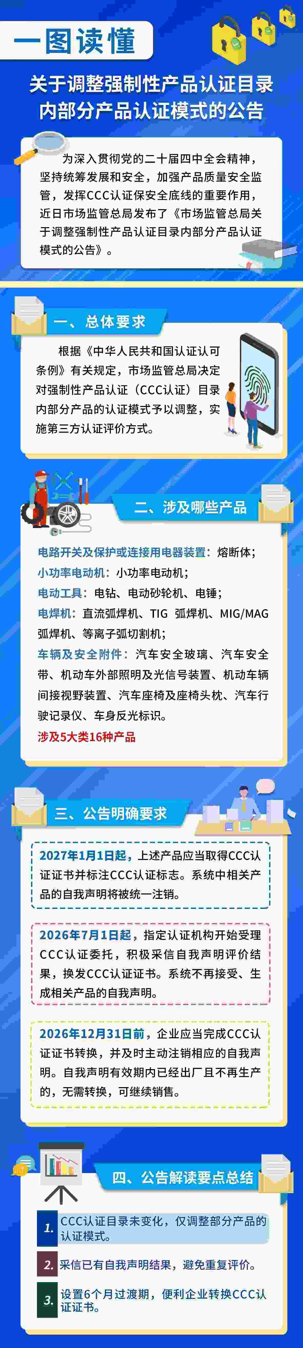 《公告》明確,電動工具、汽車安全部件等16種涉及群眾人身健康安全的產(chǎn)品,CCC認證模式由之前的企業(yè)自我聲明調(diào)整為第三方認證評價方式。