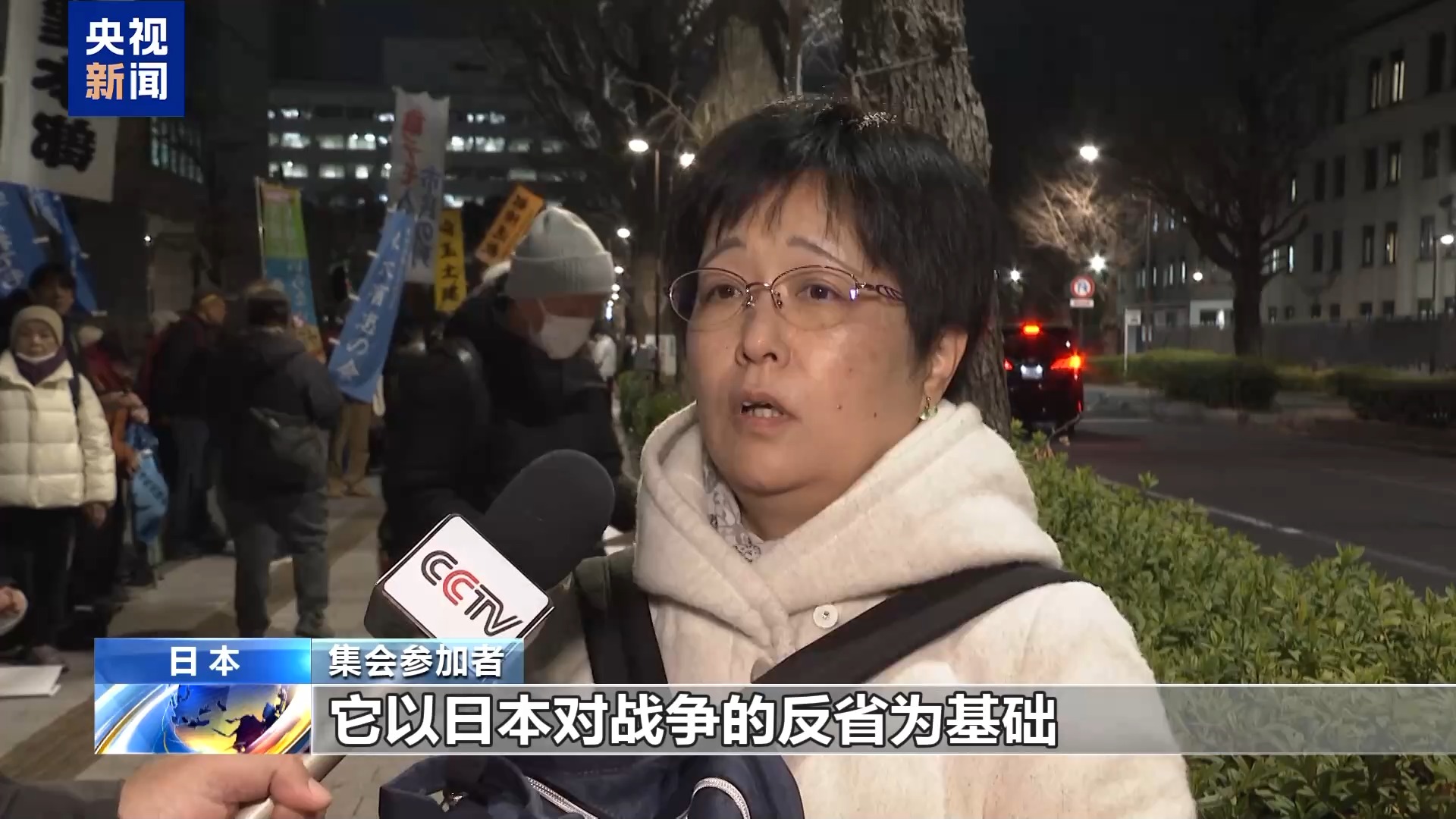 集會(huì)參加者:日本是擁有憲法第九條的國家,它以日本對(duì)戰(zhàn)爭的反省為基礎(chǔ),規(guī)定不再發(fā)動(dòng)戰(zhàn)爭。作為日本的首相,本應(yīng)挺起胸膛捍衛(wèi)和平才對(duì)。