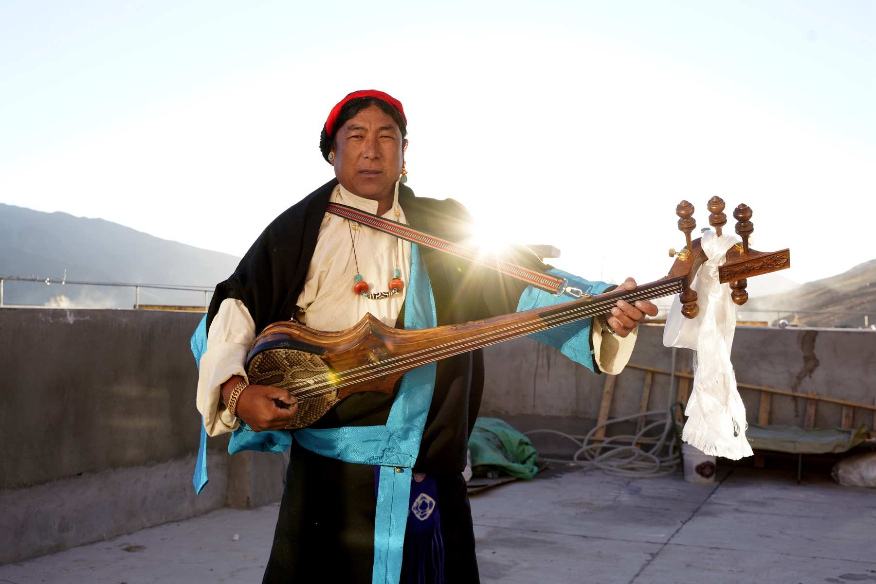 拍攝日,陽光清澈,天空湛藍(lán)。村民們穿上了最隆重的藏裝,女人發(fā)間的珊瑚與綠松石流淌著溫潤的光澤。許多老人被子女小心攙扶而來,他們的眼神里有局促,有陌生,也有隱約的期待。
