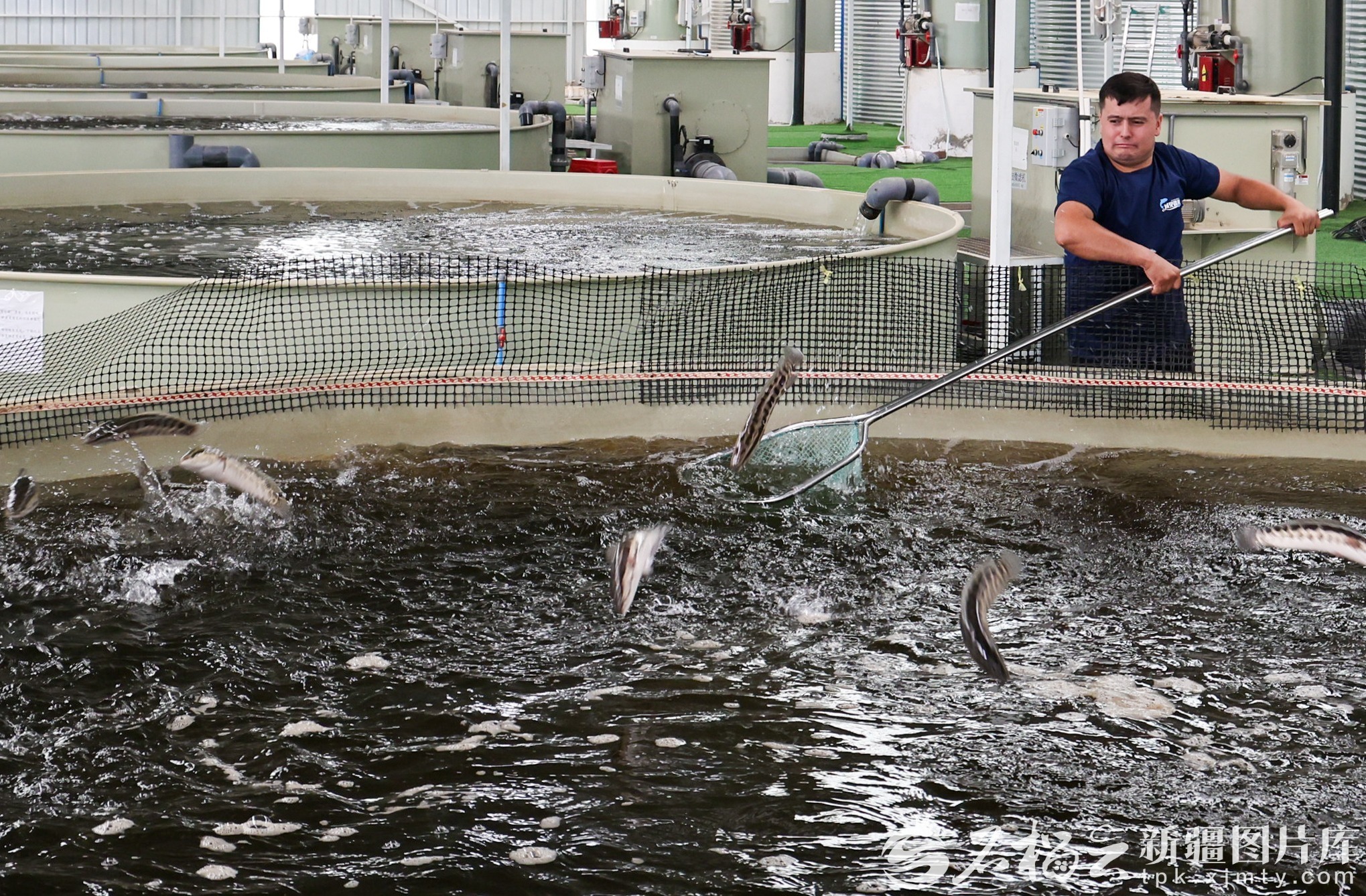 和田域見疆來水產(chǎn)養(yǎng)殖有限責(zé)任公司員工在對養(yǎng)殖池的黑魚進(jìn)行捕撈。許曉龍攝(資料圖)