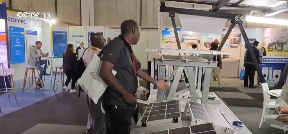 這個新能源產品可以說是非常具有非洲特色,它的上面是兩片光伏板,下面是兩個可以調整角度的攝像頭,用光伏發(fā)電來支持攝像頭的運行,還有把路燈、攝像頭和光伏結合在一起的。