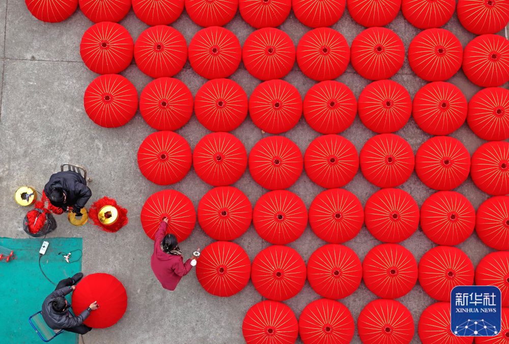 ↑ 1月21日,在浙江省臺州市仙居縣橫溪鎮(zhèn)一家燈籠加工作坊,工人趕制大紅燈籠(無人機(jī)照片)。新華社發(fā)(王華斌攝)
