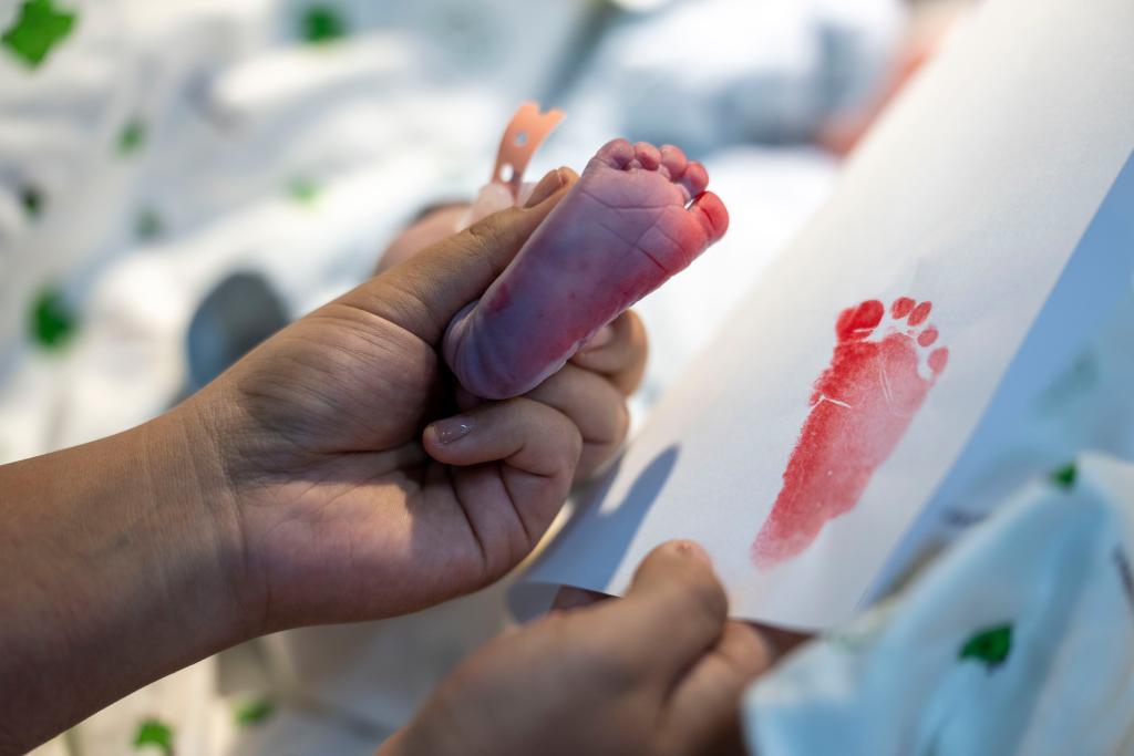 2026年1月1日,西藏自治區(qū)人民醫(yī)院婦產(chǎn)科助產(chǎn)醫(yī)生為新生兒印腳印。新華社記者旦增尼瑪曲珠攝