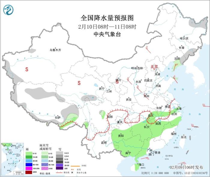 2月9日08時至10日08時,新疆西北部、西藏東北部和南部、青海北部、甘肅河西、山西中南部、山東大部、湖北西部、湖南西北部、重慶東北部等地部分地區(qū)有小雪或雨夾雪,局地有中雪;貴州東北部、湖南西部等地高海拔山區(qū)有凍雨。江漢東部、江淮、江南及重慶東南部、貴州大部、廣西中部和北部、云南南部、海南島東部、臺灣島東部等地部分地區(qū)有小雨。新疆東部和南部、青海中東部、內(nèi)蒙古中西部、甘肅中西部、寧夏、陜西北部等地的部分地區(qū)有揚(yáng)沙或浮塵天氣,局地有沙塵暴。新疆北疆東部和南疆山區(qū)、內(nèi)蒙古西部、青海大部、甘肅河西、寧夏大部、西藏西部和北部、川西高原北部等地有5~7級風(fēng)、陣風(fēng)8~9級;東海南部海域、臺灣海峽、臺灣以東洋面、巴士海峽、南海大部海域、瓊州海峽、北部灣將有7~8級、陣風(fēng)9級的大風(fēng),其中,巴士海峽、南海東部海域的部分海域風(fēng)力可達(dá)9級、陣風(fēng)10級(見圖2)。