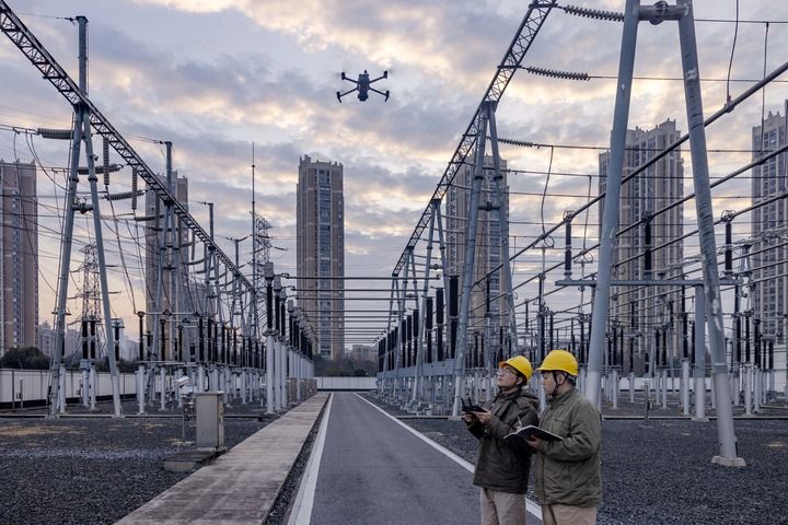 2月17日,國網(wǎng)泰州供電公司運維人員在220千伏寺巷變電站利用無人機巡檢電力設備。新華社發(fā)(湯德宏 攝)