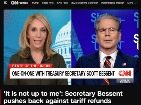 貝森特當(dāng)天在CNN接受采訪時強(qiáng)調(diào)兩點(diǎn):第一,最高法院對總統(tǒng)依據(jù)IEEPA征收關(guān)稅的權(quán)力做了“非常狹義”的解讀,但并沒有涉及退款問題;第二,案件已發(fā)回下級法院,因此退款“不是政府決定,而是由下級法院決定”。 如果只看字面,這兩句話都有一定真實性,但若看整體效果,卻更像是一場有技巧的責(zé)任轉(zhuǎn)移。