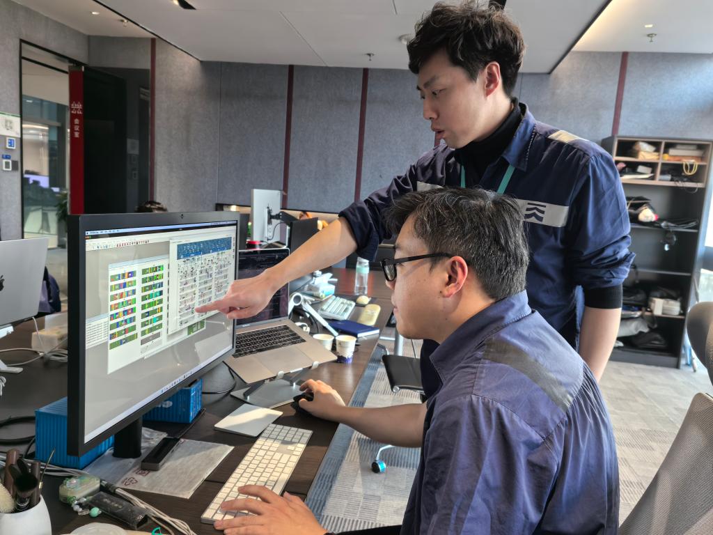 天津港第二集裝箱碼頭有限公司信息部副經(jīng)理班宏宇(后)和同事正在研究新的優(yōu)化方案。新華社記者 楊文 攝