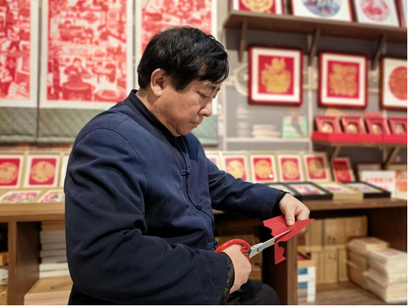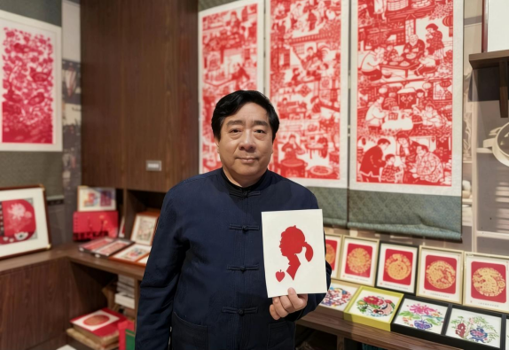 工坊中央,克樹(shù)利被層層觀眾圍住,叫好聲此起彼伏。只見(jiàn)他手持一張巴掌大的紅紙,目光在人群中一掃,隨手拉住前排一位扎馬尾辮的小姑娘,手上的剪刀便如游龍般翻飛起來(lái)。不畫(huà)底稿、不做標(biāo)記,紅紙?jiān)谒种行D(zhuǎn)變形,幾十秒的工夫,一把剪刀開(kāi)合之間,一張惟妙惟肖的人影剪紙便已成型——俏皮的馬尾辮、抿著嘴的笑臉,甚至連小姑娘頭頂上的發(fā)卡都清晰可見(jiàn)?!跋?!太像了!”圍觀人群中爆發(fā)出一陣熱烈的掌聲,小姑娘捧著剪紙,喜笑顏開(kāi)。