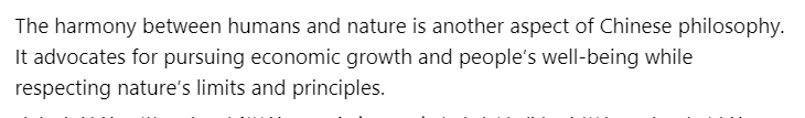 文章還認為,人與自然的和諧是中國哲學的另一個方面。它主張在追求經(jīng)濟增長和人民福祉的同時,尊重自然的發(fā)展規(guī)律。