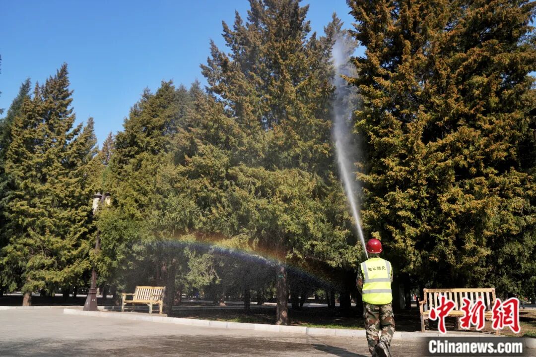 園林綠化工作人員在北京地壇公園對(duì)圓柏使用花粉控制劑。中新社記者 張祥毅 攝