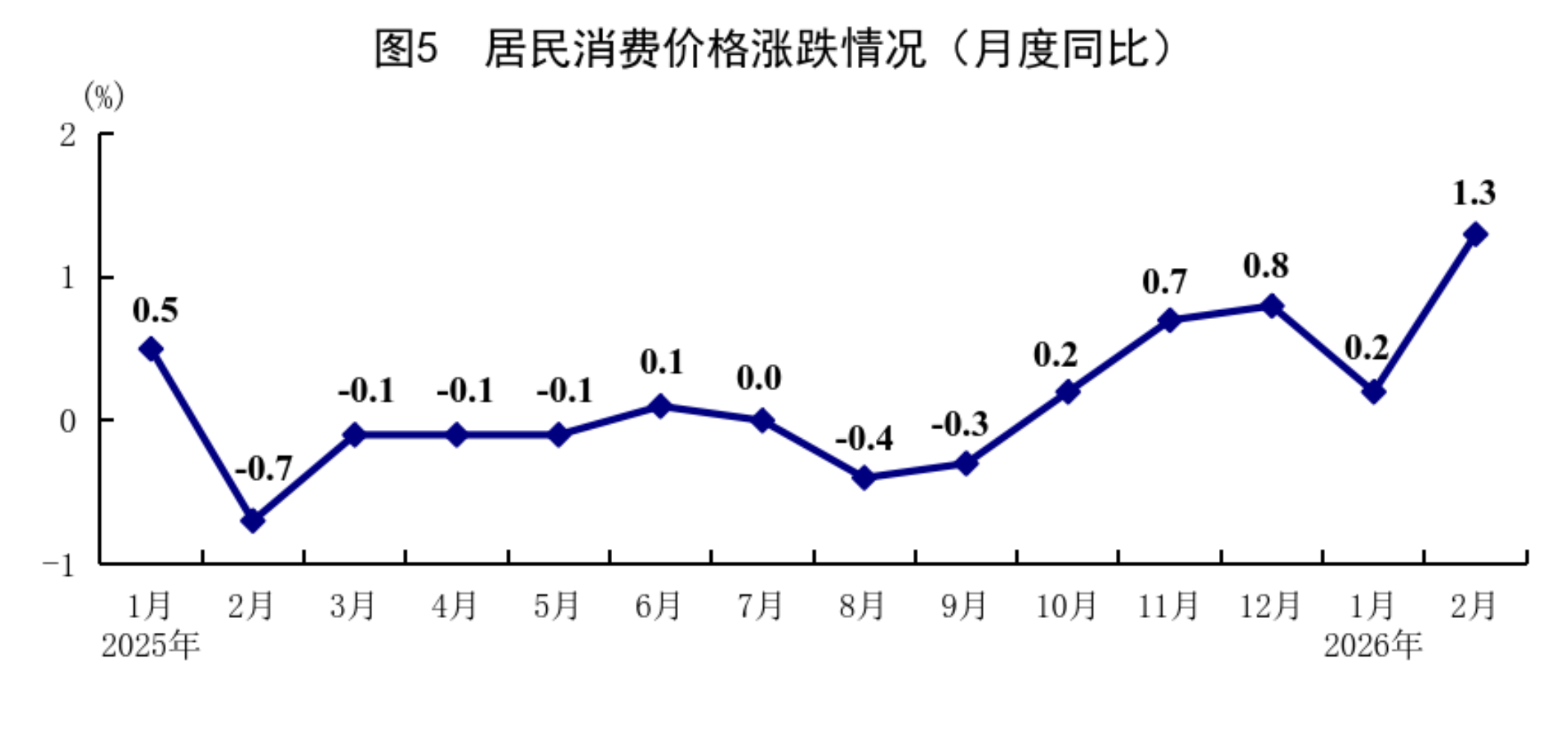 1—2月份,全國居民消費(fèi)價(jià)格(CPI)同比上漲0.8%,其中1月份上漲0.2%,2月份上漲1.3%。分類別看,1—2月份,食品煙酒及在外餐飲價(jià)格同比上漲0.6%,衣著價(jià)格上漲1.9%,居住價(jià)格下降0.1%,生活用品及服務(wù)價(jià)格上漲2.7%,交通通信價(jià)格下降2.1%,教育文化娛樂價(jià)格上漲1.0%,醫(yī)療保健價(jià)格上漲1.8%,其他用品及服務(wù)價(jià)格上漲14.3%。在食品煙酒及在外餐飲價(jià)格中,豬肉價(jià)格下降11.2%,糧食價(jià)格下降0.2%,鮮果價(jià)格上漲4.5%,鮮菜價(jià)格上漲8.8%??鄢称泛湍茉磧r(jià)格后的核心CPI同比上漲1.3%。從環(huán)比看,1月份,全國居民消費(fèi)價(jià)格上漲0.2%,2月份上漲1.0%。