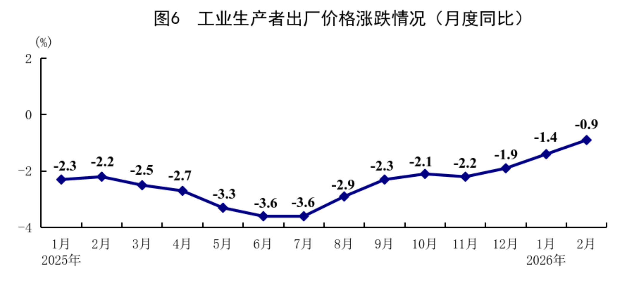 1—2月份,全國工業(yè)生產(chǎn)者出廠價(jià)格同比下降1.2%。分月看,1月份同比下降1.4%,環(huán)比上漲0.4%;2月份同比下降0.9%,環(huán)比上漲0.4%。1—2月份,全國工業(yè)生產(chǎn)者購進(jìn)價(jià)格同比下降1.1%。