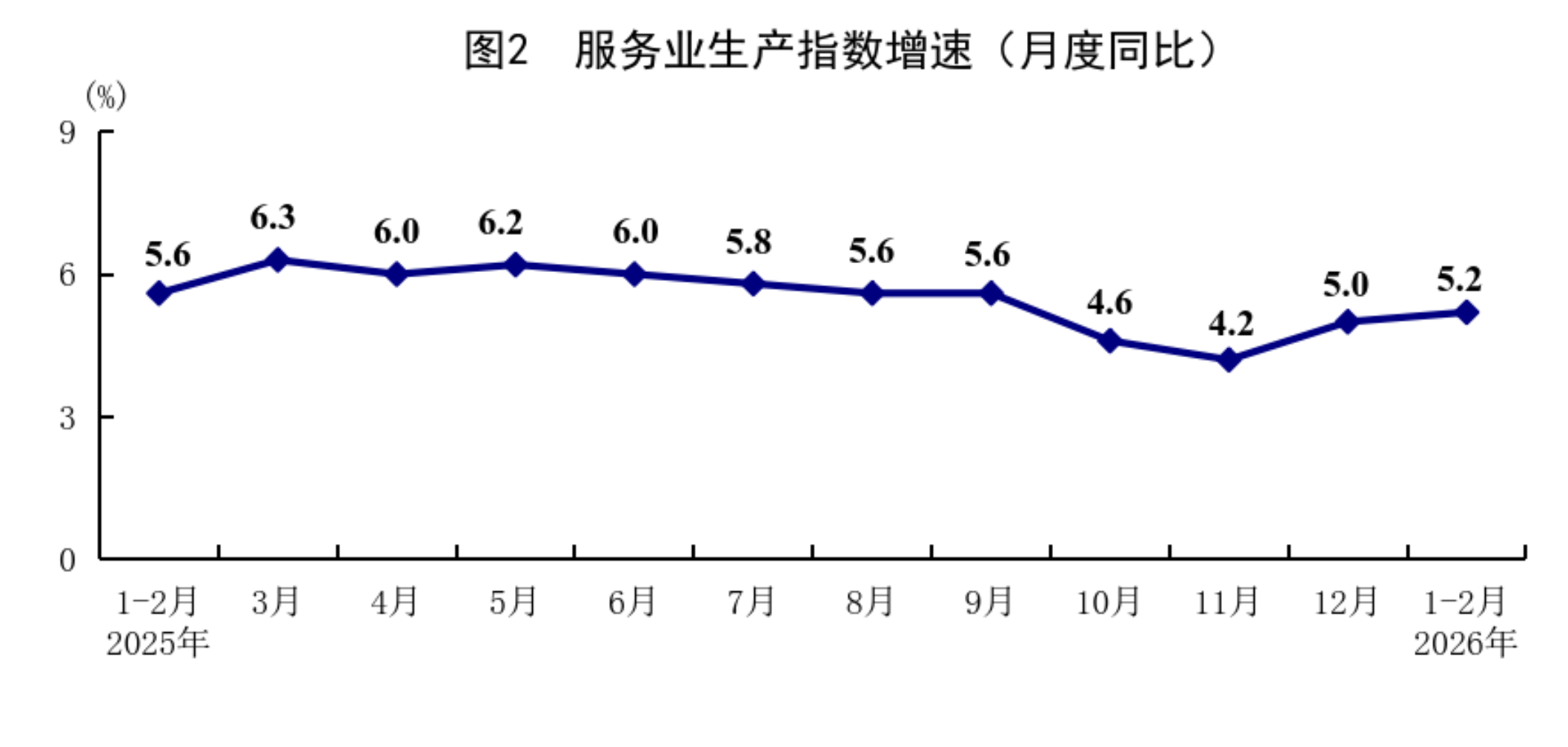 1—2月份,全國服務(wù)業(yè)生產(chǎn)指數(shù)同比增長5.2%,比上年12月份加快0.2個(gè)百分點(diǎn)。分行業(yè)看,信息傳輸、軟件和信息技術(shù)服務(wù)業(yè),租賃和商務(wù)服務(wù)業(yè),金融業(yè),交通運(yùn)輸、倉儲(chǔ)和郵政業(yè),住宿和餐飲業(yè)生產(chǎn)指數(shù)分別增長10.1%、8.2%、7.0%、6.3%、5.4%。2月份,服務(wù)業(yè)商務(wù)活動(dòng)指數(shù)為49.7%,比上月上升0.2個(gè)百分點(diǎn);服務(wù)業(yè)業(yè)務(wù)活動(dòng)預(yù)期指數(shù)為55.8%。其中,住宿、餐飲、文化體育娛樂等行業(yè)商務(wù)活動(dòng)指數(shù)位于60.0%以上高位景氣區(qū)間。