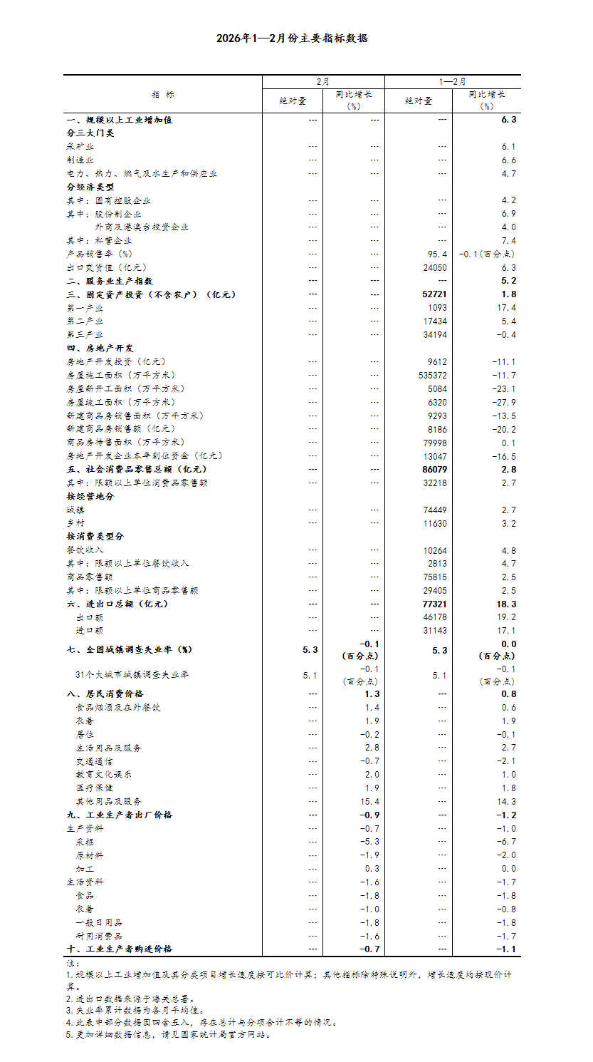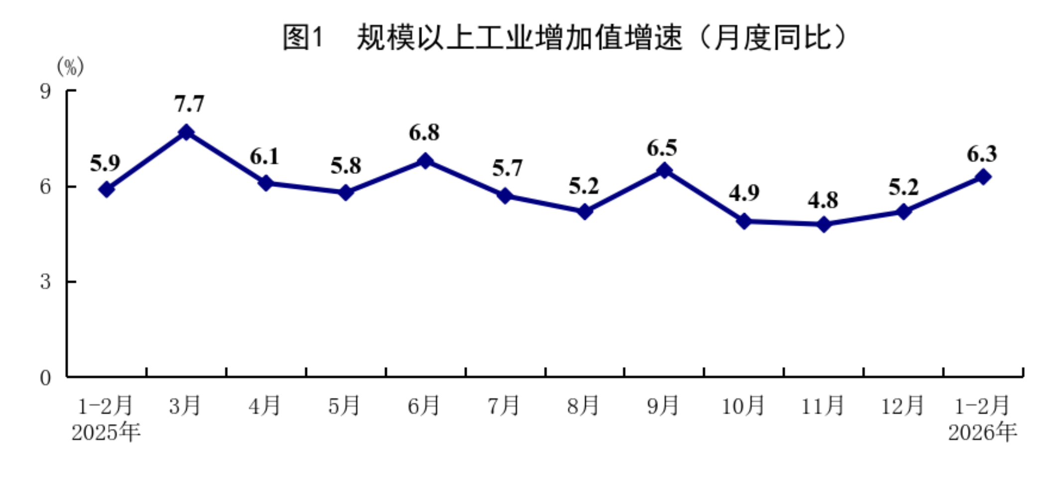 1—2月份,全國規(guī)模以上工業(yè)增加值同比增長6.3%,比上年12月份加快1.1個(gè)百分點(diǎn)。分三大門類看,采礦業(yè)增加值同比增長6.1%,制造業(yè)增長6.6%,電力、熱力、燃?xì)饧八a(chǎn)和供應(yīng)業(yè)增長4.7%。裝備制造業(yè)增加值同比增長9.3%,高技術(shù)制造業(yè)增加值增長13.1%,分別快于全部規(guī)模以上工業(yè)增加值3.0和6.8個(gè)百分點(diǎn)。分經(jīng)濟(jì)類型看,國有控股企業(yè)增加值同比增長4.2%;股份制企業(yè)增長6.9%,外商及港澳臺(tái)投資企業(yè)增長4.0%;私營企業(yè)增長7.4%。分產(chǎn)品看,3D打印設(shè)備、鋰離子電池、工業(yè)機(jī)器人產(chǎn)品產(chǎn)量同比分別增長54.1%、42.6%、31.1%。從環(huán)比看,2月份規(guī)模以上工業(yè)增加值比上月增長0.83%。2月份,制造業(yè)采購經(jīng)理指數(shù)為49.0%;企業(yè)生產(chǎn)經(jīng)營活動(dòng)預(yù)期指數(shù)為53.2%,比上月上升0.6個(gè)百分點(diǎn)。