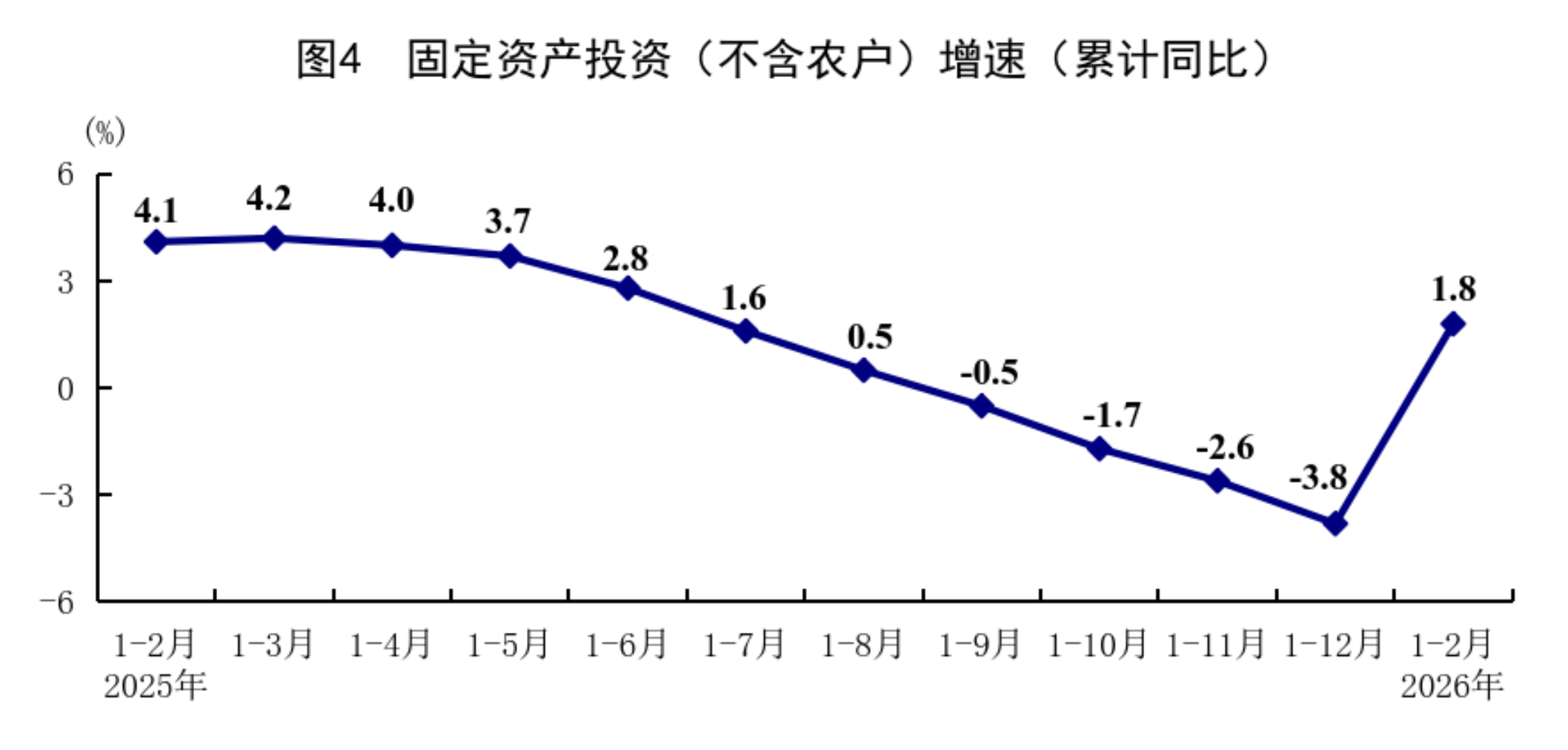 1—2月份,全國固定資產(chǎn)投資(不含農(nóng)戶)52721億元,同比增長1.8%,上年全年為下降3.8%;扣除房地產(chǎn)開發(fā)投資,全國固定資產(chǎn)投資增長5.2%。分領(lǐng)域看,基礎(chǔ)設(shè)施投資同比增長11.4%,制造業(yè)投資增長3.1%,房地產(chǎn)開發(fā)投資下降11.1%。全國新建商品房銷售面積9293萬平方米,同比下降13.5%;新建商品房銷售額8186億元,下降20.2%。分產(chǎn)業(yè)看,第一產(chǎn)業(yè)投資同比增長17.4%,第二產(chǎn)業(yè)投資增長5.4%,第三產(chǎn)業(yè)投資下降0.4%。民間投資同比下降2.6%,降幅比上年全年收窄3.8個(gè)百分點(diǎn);扣除房地產(chǎn)開發(fā)投資,民間投資增長1.0%。高技術(shù)產(chǎn)業(yè)投資同比增長5.1%,其中航空、航天器及設(shè)備制造業(yè),研發(fā)與設(shè)計(jì)服務(wù)業(yè),信息服務(wù)業(yè)投資分別增長20.2%、20.6%、16.5%。從環(huán)比看,2月份固定資產(chǎn)投資(不含農(nóng)戶)比上月增長0.39%。