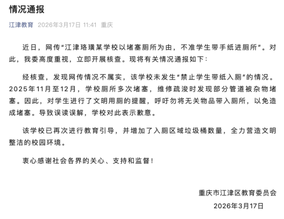 中國網(wǎng)3月18日訊 重慶市江津區(qū)教育委員會17日發(fā)布消息,近日,網(wǎng)傳“江津珞璜某學(xué)校以堵塞廁所為由,不準(zhǔn)學(xué)生帶手紙進(jìn)廁所”。對此,江津區(qū)教育委員會高度重視,立即開展核查?,F(xiàn)將有關(guān)情況通報(bào)如下:
