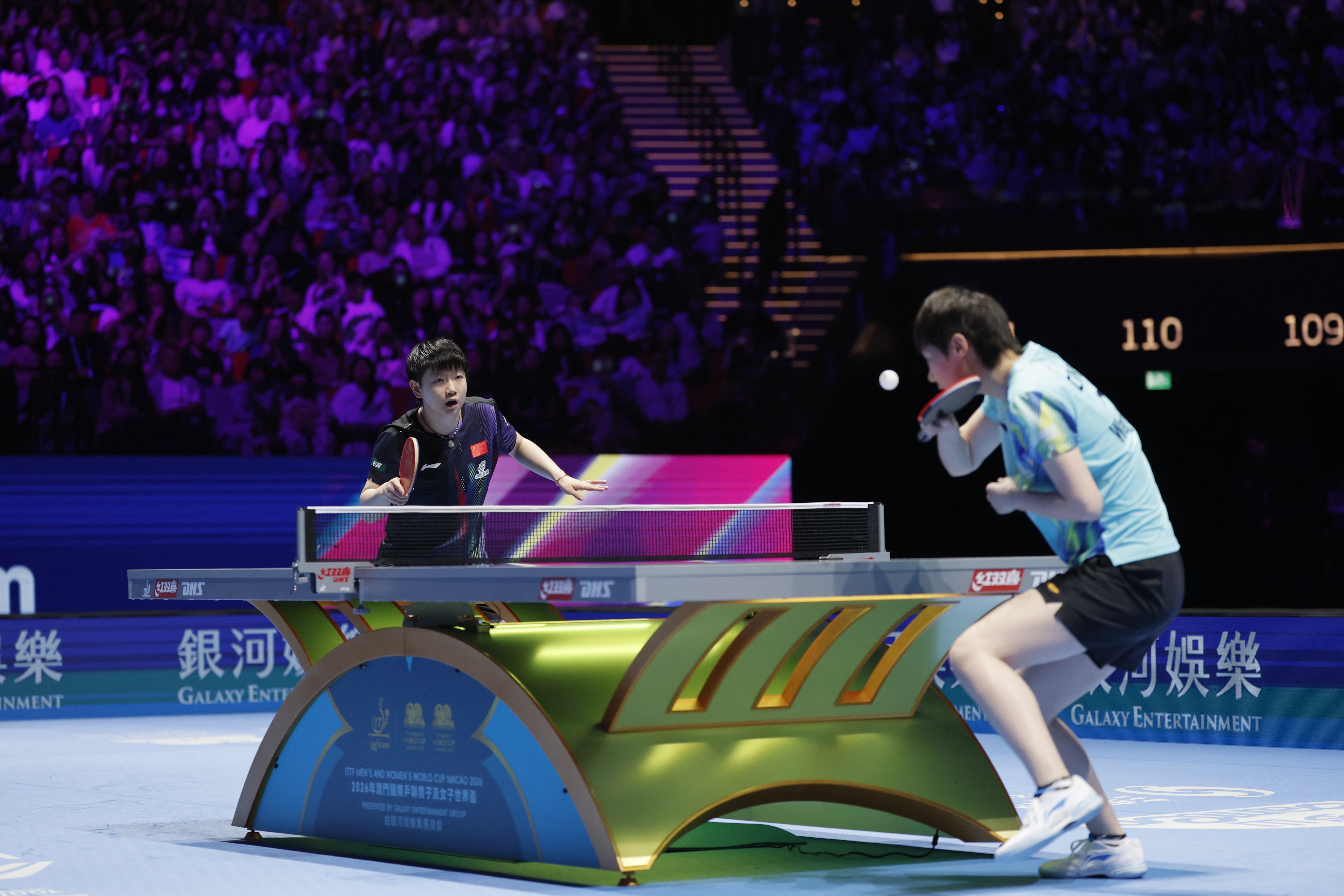 北京時(shí)間4月5日晚,國(guó)際乒聯(lián)單打世界杯女單決賽,孫穎莎4-1戰(zhàn)勝王曼昱,衛(wèi)冕冠軍,實(shí)現(xiàn)該項(xiàng)賽事“三連冠”。(總臺(tái)記者 劉冰清)