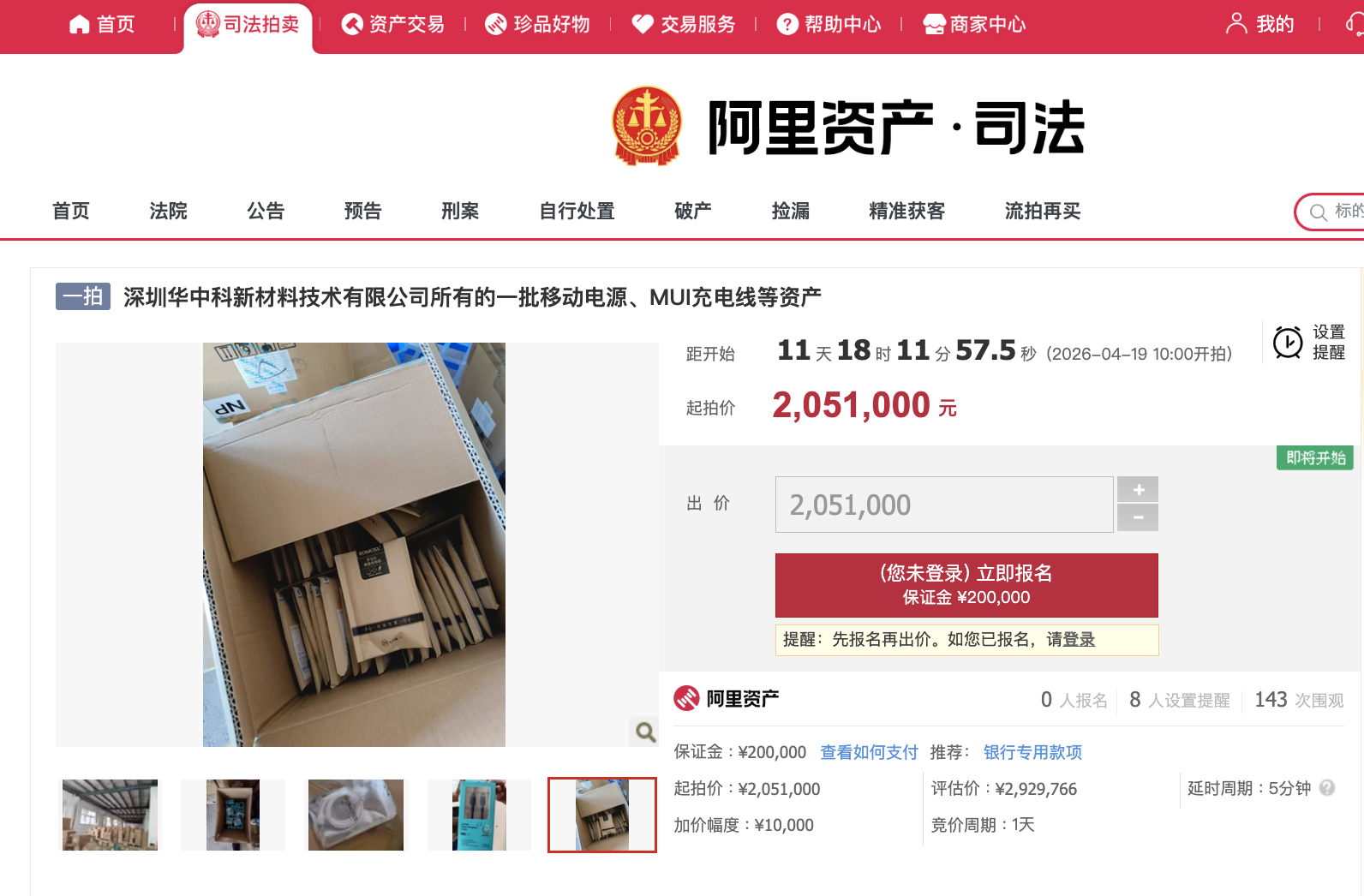 中新網(wǎng)4月7日電(吳家駒)阿里資產(chǎn)·司法平臺顯示,近日,深圳華中科新材料技術(shù)有限公司所有的一批資產(chǎn)將被司法拍賣,包括:20560只移動電源、147478根MUI充電線等,起拍價205.1萬元,評估價約292.98萬元,拍賣時間為4月19日10時至4月20日10時。