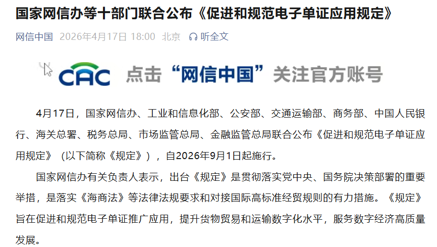 中國網(wǎng)4月17日訊 據(jù)網(wǎng)信中國微信公眾號消息,4月17日,國家網(wǎng)信辦、工業(yè)和信息化部、公安部、交通運輸部、商務(wù)部、中國人民銀行、海關(guān)總署、稅務(wù)總局、市場監(jiān)管總局、金融監(jiān)管總局聯(lián)合公布《促進(jìn)和規(guī)范電子單證應(yīng)用規(guī)定》(以下簡稱《規(guī)定》),自2026年9月1日起施行。