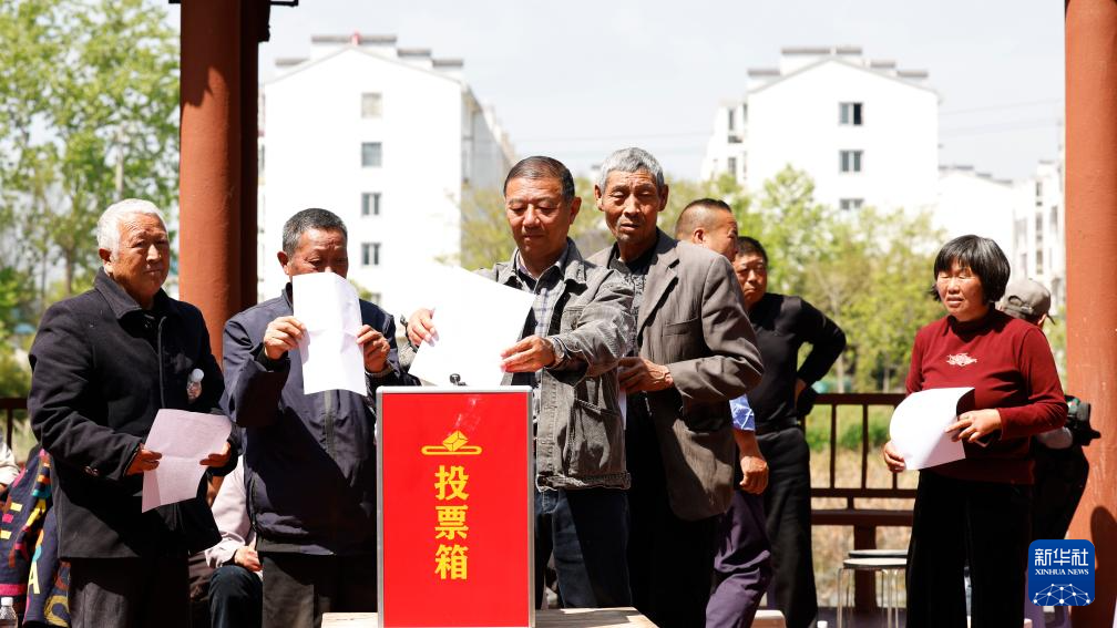 4月19日,泗洪縣上塘鎮(zhèn)墊湖村村民代表往票箱里投放民生實事表決表。