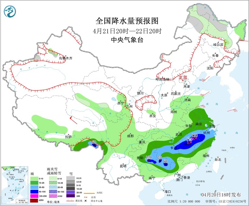 4月20日20時(shí)至21日20時(shí),內(nèi)蒙古東北部、黑龍江西北部、新疆沿天山地區(qū)、青海中部和東北部、甘肅河西等地部分地區(qū)有小雪或雨夾雪,其中,內(nèi)蒙古東北部、黑龍江西北部等地部分地區(qū)有中到大雪(5~8毫米)。西北地區(qū)東南部、黃淮西部、江漢東部、江南大部、四川盆地東北部、華南西部、北部和東南部等地部分地區(qū)有中到大雨,其中,湖南南部和東部、江西中北部、廣西東北部等地部分地區(qū)有暴雨,局地大暴雨(100~160毫米)。內(nèi)蒙古中東部、吉林、黑龍江東南部以及新疆南疆盆地、西藏北部、青海中西部等地部分地區(qū)有5~7級(jí)風(fēng),陣風(fēng)8~9級(jí),其中內(nèi)蒙古中部、吉林中東部等地局地有8~9級(jí)風(fēng),陣風(fēng)10級(jí)以上;渤海、渤海海峽、黃海北部部分海域?qū)⒂?級(jí)、陣風(fēng)8級(jí)的大風(fēng)(見圖3)。