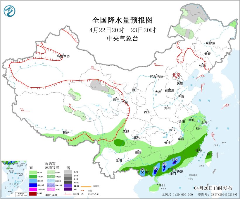 4月22日20時(shí)至23日20時(shí),內(nèi)蒙古東北部、黑龍江西北部、青藏高原北部、甘肅河西等地部分地區(qū)有小雪或雨夾雪。江南東部和南部、華南中南部等地部分地區(qū)有中到大雨,其中,廣西東南部、廣東西部和北部等地部分地區(qū)有暴雨或大暴雨(100~110毫米)。內(nèi)蒙古大部、遼東半島、山東半島、甘肅河西、青藏高原等地部分地區(qū)有4~6級(jí)風(fēng)。東海北部海域?qū)⒂?~8級(jí)大風(fēng)、陣風(fēng)9級(jí);黃海南部海域、東海南部海域、臺(tái)灣海峽、臺(tái)灣以東洋面、北部灣將有5~6級(jí)大風(fēng)、陣風(fēng)7級(jí)(見圖5)。