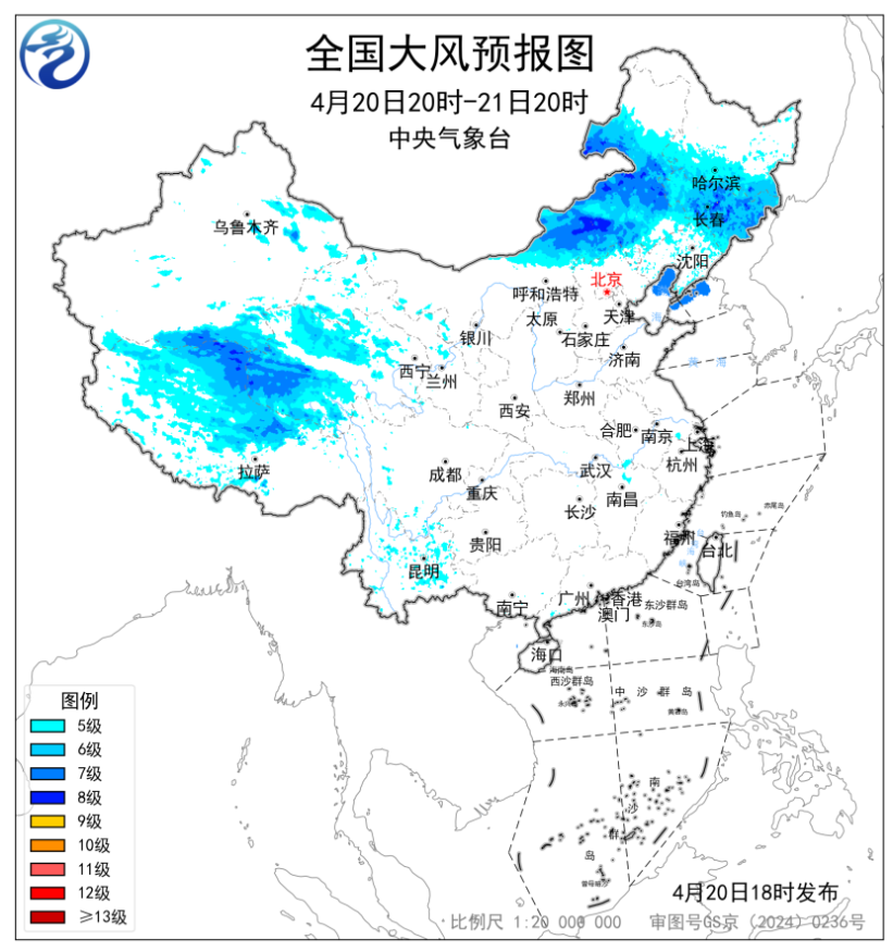 預(yù)計(jì)4月20日20時(shí)至21日20時(shí),內(nèi)蒙古中東部、吉林、黑龍江東南部以及新疆南疆盆地、西藏北部、青海中西部等地部分地區(qū)有5~7級(jí)風(fēng),陣風(fēng)8~9級(jí),其中內(nèi)蒙古中部、吉林中東部等地局地有8~9級(jí)風(fēng),陣風(fēng)10級(jí)以上;渤海、渤海海峽、黃海北部部分海域?qū)⒂?級(jí)、陣風(fēng)8級(jí)的大風(fēng)(見圖2)。中央氣象臺(tái)4月20日18時(shí)發(fā)布大風(fēng)藍(lán)色預(yù)警。