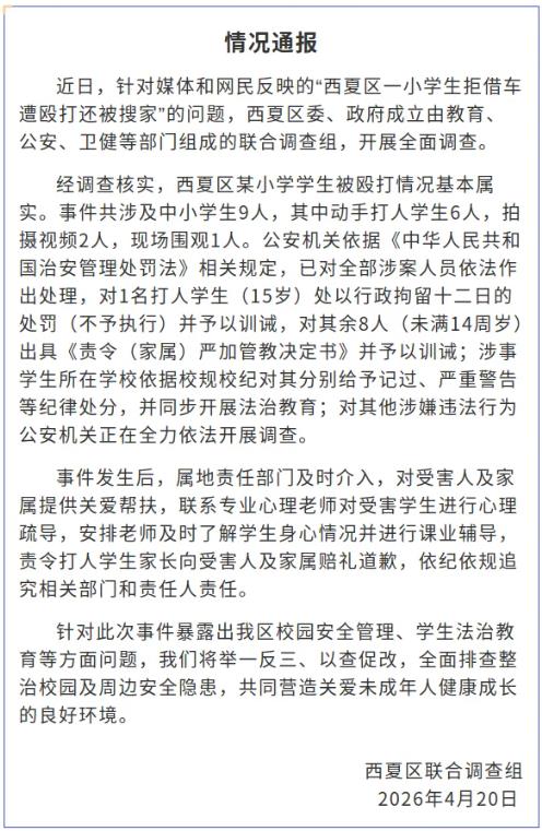 經(jīng)調(diào)查核實,西夏區(qū)某小學學生被毆打情況基本屬實。事件共涉及中小學生9人,其中動手打人學生6人,拍攝視頻2人,現(xiàn)場圍觀1人。公安機關依據(jù)《中華人民共和國治安管理處罰法》相關規(guī)定,已對全部涉案人員依法作出處理,對1名打人學生(15歲)處以行政拘留十二日的處罰(不予執(zhí)行)并予以訓誡,對其余8人(未滿14周歲)出具《責令(家屬)嚴加管教決定書》并予以訓誡;涉事學生所在學校依據(jù)校規(guī)校紀對其分別給予記過、嚴重警告等紀律處分,并同步開展法治教育;對其他涉嫌違法行為公安機關正在全力依法開展調(diào)查。