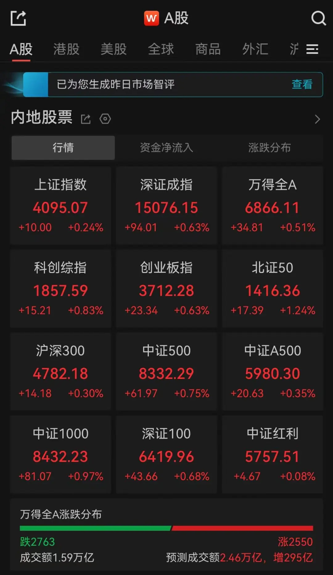 22日,A股三大指數(shù)低開后震蕩上行,集體翻紅。截至午間收盤,滬指漲0.24%,深證成指漲0.63%,創(chuàng)業(yè)板指漲0.63%。全市半日成交額1.59萬億,超2700只個股下跌。