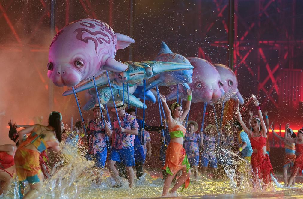全場(chǎng)燈光轉(zhuǎn)為夢(mèng)幻的深藍(lán)色,巨型水母在空中漂移,儒艮、鯨鯊、海龜游弋于觀眾席。潛水員海底探秘,與紅珊瑚翩然共舞。此刻,蔚藍(lán)同脈,萬物共生——光影交織的海底世界里,流淌著人與自然和諧相處的哲學(xué)智慧。