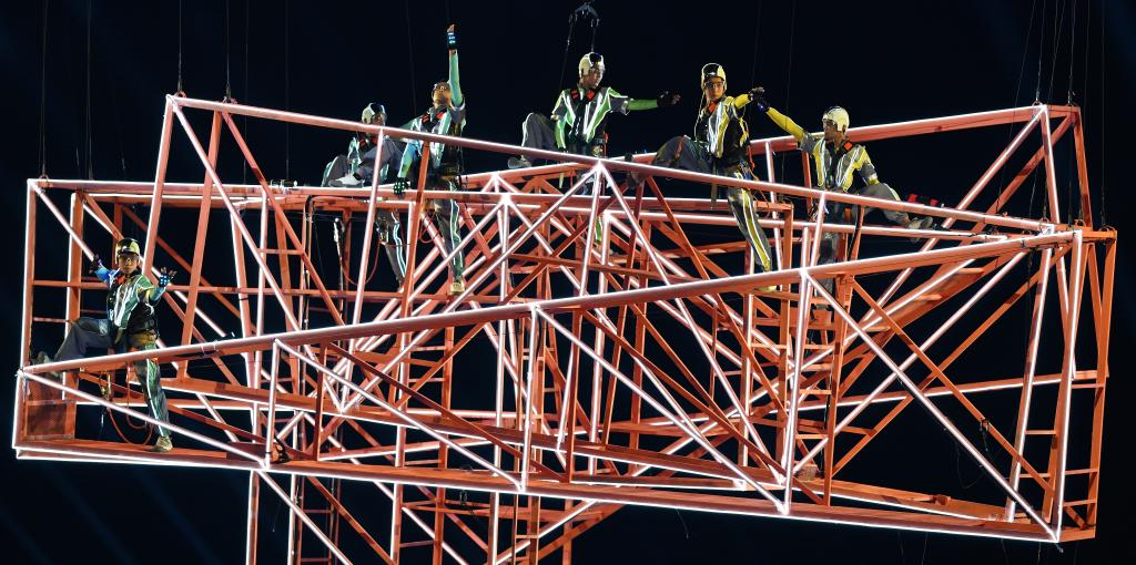 音樂重新變得動(dòng)感十足,“亞亞”變身自貿(mào)港建設(shè)者再次登場(chǎng)。8組空中威亞裝置通過矩陣組合,變換成大型吊臂、拱形橋梁與深海鉆井平臺(tái),寓意拔地而起的“夢(mèng)想巔峰”。逐夢(mèng)者在巨大的鋼架道具上奮力攀登、彼此托舉,象征著自貿(mào)港建設(shè)者攻堅(jiān)克難的歷程。